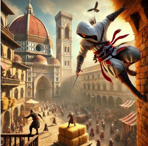 Showcasing the gameplay mechanics of Assassin's Creed II (2009). It features Ezio Auditore performing parkour, stealth blending, and a leap of faith, set against the vibrant and dynamic backdrop of Renaissance Florence.