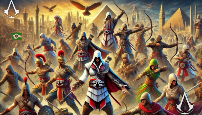 Not an actual game image but showcasing diverse Assassins from around the world, showcasing their unique styles, weapons, and cultural backgrounds.